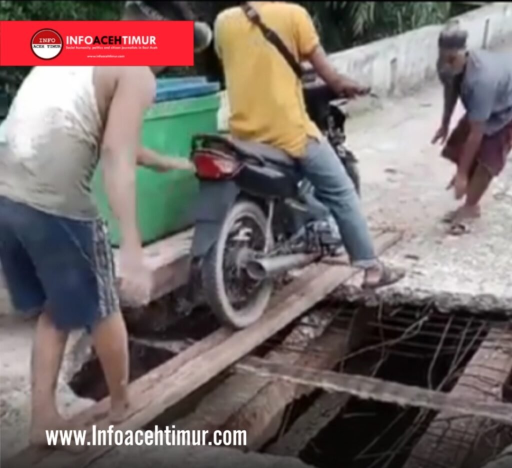 Infoacehtimur.com | Aceh Timur – Badan jembatan di Desa Teupin Drum yang menyambung dengan Alue Dua Muka Es. Kecamatan Idi Rayeuk, Kabupaten Aceh Timur kian meresahkan. Kamis 14/07/2022. Hal ini sangat mengkhawatirkan terhadap pengguna Jalan terutama bagi pengguna roda dua, tiga dan empat karena badan jembatan tersebut sudah berlobang bagaikan sarang buaya. “Menurut keterangan masyarakat desa tersebut menerangkan kepada awak media infoacehtimur.com kami sangat mohon kepada bapak-bapak ini semua, tolong lah bantu kami. agar jembatan ini bisa dibuat oleh dinas yang terkait,”terangnya masyarakat Sambungnya lagi, “karena kami sudah pernah meminta bersama Pak Geuchik, untuk berjumpa sama anggota PU di kabupaten…
