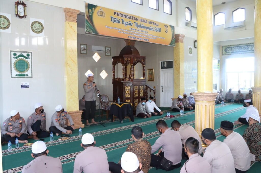 Aceh Timur | Bertempat di Mesjid Babuttaqwa, Polres Aceh Timur Gelar Peringatan Isra Mi’raj Nabi Muhammad SAW, 27 Rajab 1443 H yang dihadiri oleh Kapolres Aceh Timur AKBP Mahmun Hari Sandy Sinurat, S.I.K., Wakapolres Kompol Chairul Ikhsan, S.I.K., para pejabat utama polres, para kapolsek jajaran dan seluruh personel Polres Aceh Timur. Jum’at, (04/03/2022). Kegiatan ini mengangkat tema “Dengan Hikmah Isra’ Mi’raj Nabi besar Muhammad SAW Kita Tingkatkan Keimanan Dan Kinerja Guna Mewujudkan Polri Yang Presisi.” Dalam sambutannya Kapolres mengajak seluruh personel Polres Timur untuk menghidupkan suasana agama di dalam keluarga, “Mari Kita hidupkan kembali suasana agama dalam keluarga kita, Kebanyakan…