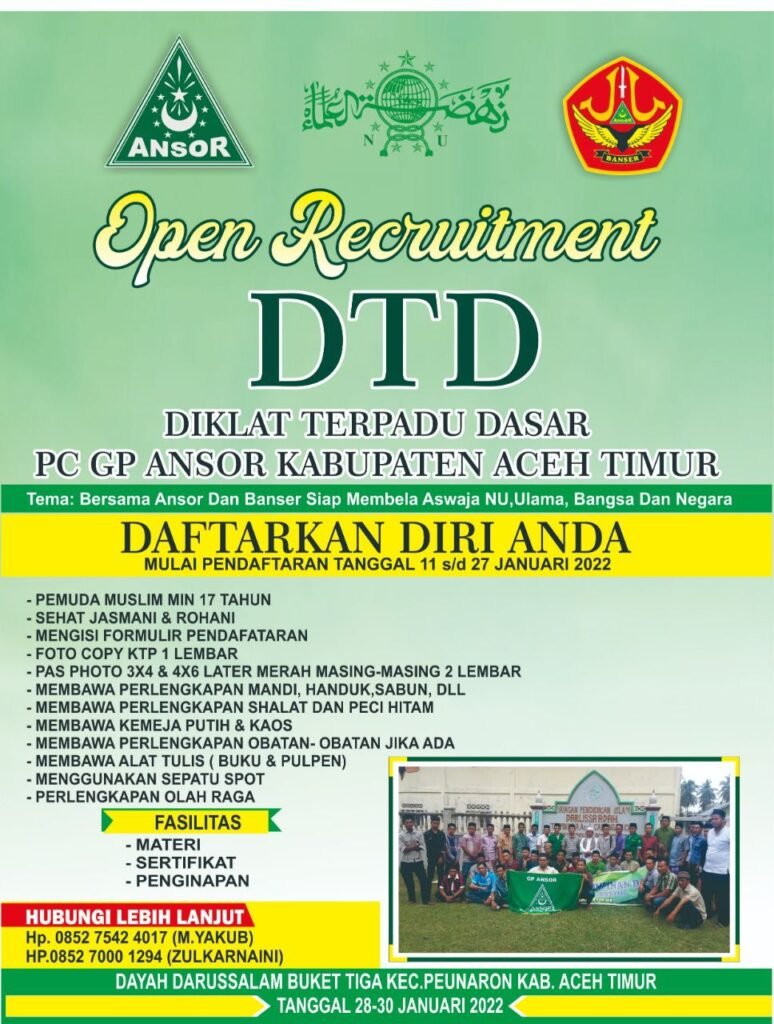 Gerakan Pemuda (GP) Ansor Cabang Aceh Timur akan melaksanakan kegiatan Diklat Terpadu Dasar (DTD) Angkatan I. Adapun kegiatan DTD ini merupakan jenjang pertama proses kaderisasi di GP Ansor maupun Banser di daerah aceh timur khususnya. Anggota panitia Pimpinan Cabang GP Ansor Aceh timur, Syahrul Maulana Mansur, megatakan, pembukaan DTD ini rencananya akan berlangsung di Aula Pondok Pesantren Dayah Darussalam bukit tiga Kecamatan Penaron Kabupaten Aceh Timur, Kamis (27/01/2021) Ia menambahkan, DTD yang mengusung tema “Bersama Ansor Dan Banser Siap Membela Aswaja NU, Ulama, Bangsa Dan Negara” tersebut akan diikuti sekitar kurang lebih 50 Peserta calon kader baru. Mereka akan ditempa…