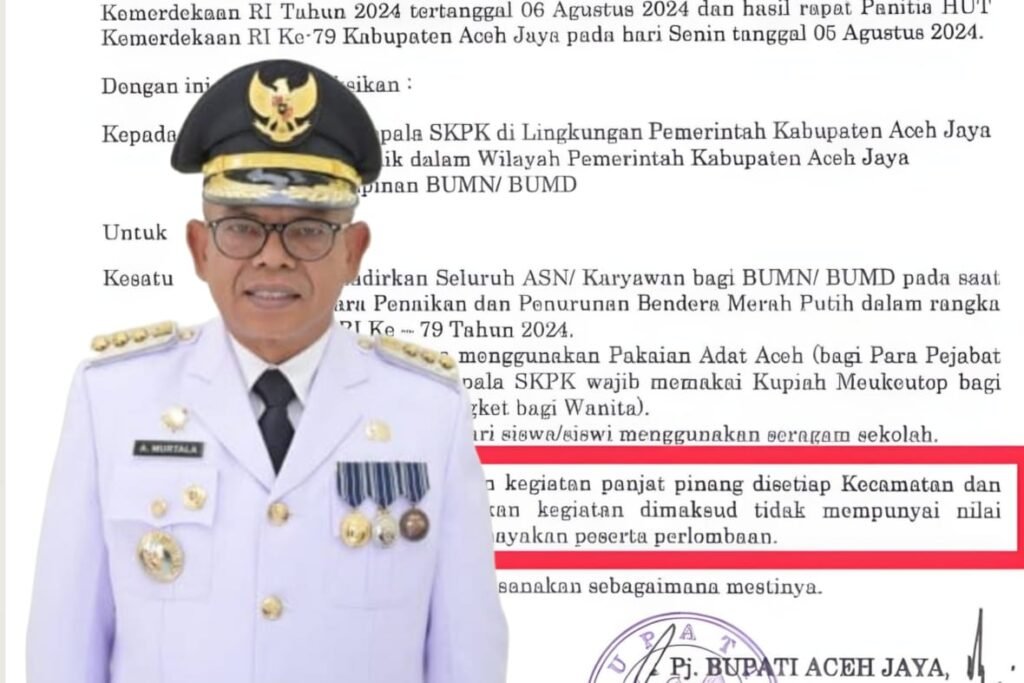 Infoacehtimur.com, Aceh Jaya – Pj Bupati Aceh Jaya mengeluarkan instruksi kepada seluruh Satuan Kerja Perangkat Kabupaten (SKPK), Keuchik, dan pimpinan BUMN/ BUMD di wilayah Aceh Jaya untuk tidak mengadakan lomba panjat pinang dalam pada peringatan HUT RI ke-79 tahun 2024. Larangan ini diberlakukan karena lomba panjat pinang dinilai tidak memiliki nilai edukasi dan membahayakan keselamatan para peserta. Hal itu tertuang dalam Instruksi Bupati Aceh Jaya Nomor: 400.14.1.1/665/2024 yang ditandatangani oleh Pj Bupati Aceh Jaya, Dr A Murtala. Baca Juga: Masyarakat Aceh Timur Bakal Gelar Aksi Unjuk Rasa Jika Panjat Tebing Dipindahkan Baca Juga: Aceh Timur Batal Jadi Tuan Rumah Panjat…