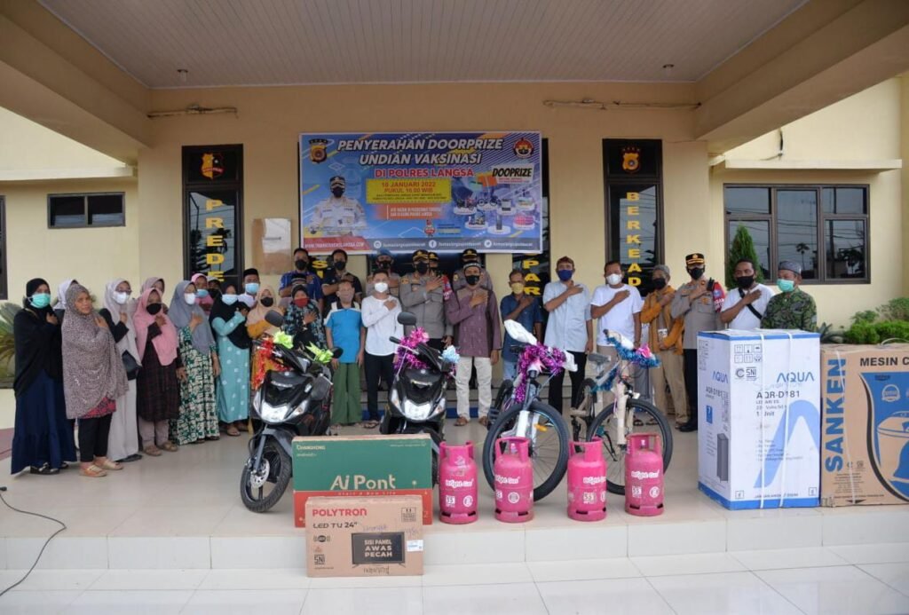 Langsa | Polres Langsa membagikan Doorprize kepada masyarakat yang beruntung dalam pengundian yang di lakukan pada tanggal 31/12/20. Kapolres Langsa AKBP Agung Kanigoro Nusantoro SH, SIK, MH yang di dampingi oleh pejabat Polres Langsa menyerahkan hadiah tersebut kepada pemenag undian vaksinasi yang gelar di depan Mapolres Langsa, senin 10/1/22 pukul 16.00 Wib. Dalam penyerahan tersebut ada 2 dua sepeda motor yang langsung di serahkan oleh Kapolres Langsa kepada pemenang undian vaksinasi Adapun pemenga undian tersebut HARIZA ALVIASYAMENDAPATKAN SEPEDA MOTORNURJANAH MENDAPAT SEPEDAMOTORCUT AINAYAH MENDAPATSEPEDAELVI SUJANA MENDAPATSEPEDAAMREH IBRAHIM MENDAPATTELEVISIRUBINEM MENDAPAT TELEVISIT.M YUSUF MENDAPAT KULKASZAINUDIN MENDAPAT KULKASSYARIBANUN MENDAPATKULKASCUT UBIT MENDAPAT HPMUZAKIR MENDAPAT HPSUPARDI…