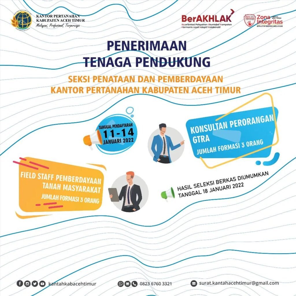 Aceh Timur | Halo #sobatATRBPN Dalam rangka pelaksanaan kegiatan penanganan akses reforma agraria guna mewujudkan peningkatan perekonomian dan taraf hidup masyarakat penerima akses reforma agraria pada Kabupaten Aceh Timur berjalan lancar, Kantor Pertanahan Kabupaten Aceh Timur memberi kesempatan pada putra-putri terbaik bangsa untuk menjadi Tenaga Konsultan (Gugus Tugas Reforma Agraria dan Field Staf Pemberdayaan Tanah Masyarakat) di lingkungan Kantor Pertanahan Kabupaten Aceh Timur Tahun Anggaran 2022 Ayo persiapkan diri Anda segera!!!!!Pendaftaran dibuka tanggal 11-14 Januari 2022 Berkas dapat dikirim melalui email: surat.kantahacehtimur@gmail.com Dukung kami mewujudkan Wilayah Birokrasi Bersih Melayani (WBBM) dengan tidak memberi tips/imbalan kepada petugas dalam bentuk apapun.