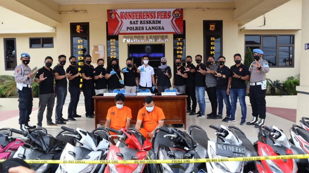 INFOACEHTIMUR.COM | Sat Reskrim Polres Langsa berhasil membekuk dua pelaku pencurian sepeda motor (curanmor) beserta 20 unit sepmor hasil curian. Kedua pelaku yakni ED (42) bekerja sebagai mekanik warga Gampong Jawa, Dusun Amaliah, Kecamatan Langsa Kota dan IW (40) warga Dusun Sentral, Gampong Sidorejo, Kecamatan Langsa Lama. Masing-masing merupakan residivis dan berperan sebagai pelaku utama curanmor/pemetik. Kapolres Langsa AKBP Agung Kanigoto Nusantoro,SH,SIK,MH melalui Kasat Reskrim Iptu Krisna Nanda Aufa,S.Tr.K,M.H, Kamis (30/12/2021), mengungkapkan bahwa pelaku melakukan aksi pencurian disejumlah tempat di Kota Langsa. Modus tersangka melakukan pencurian dengan menggunakan IW dengan menggunakan alat bantu berupa satu buah kunci pas no 8…