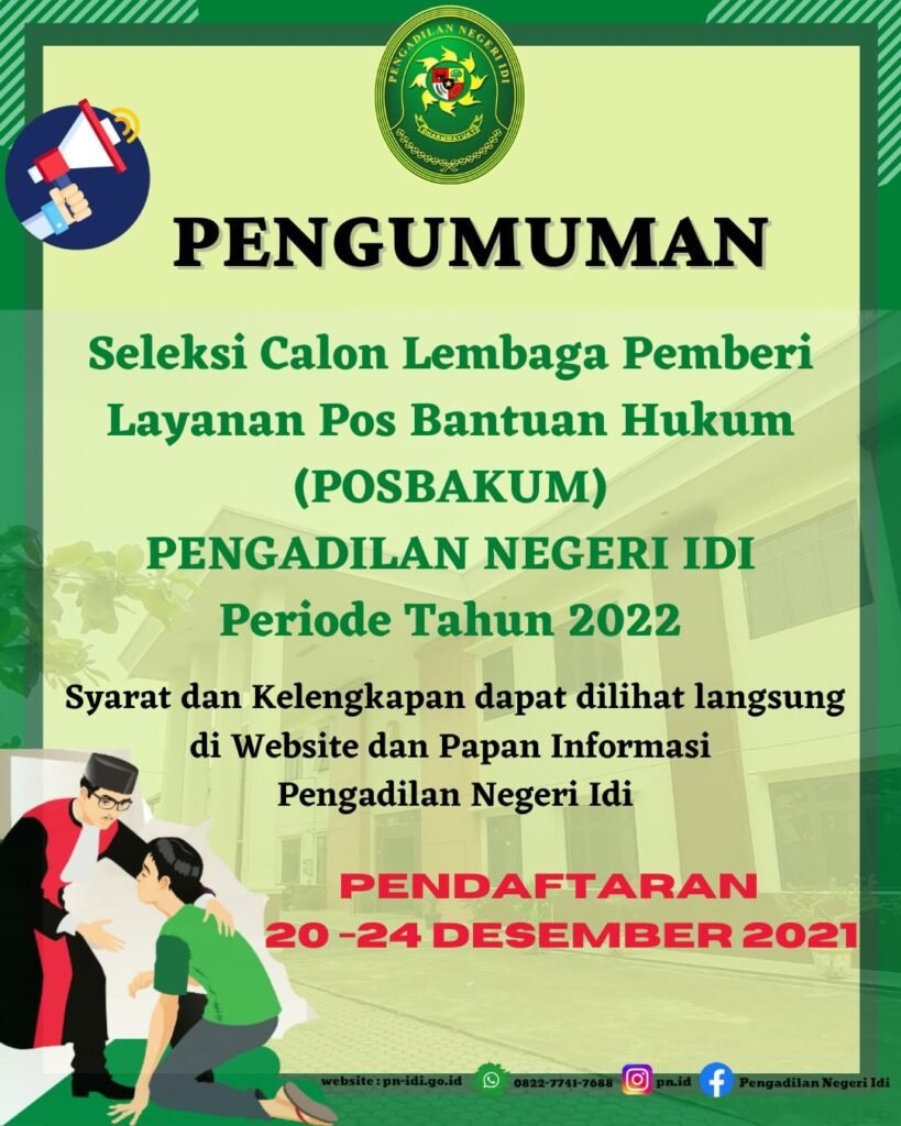 Aceh Timur | Telah dibuka pendaftaran kepada Lembaga Bantuan Hukum yang berminat mengikuti seleksi sebagai calon penyedia Jasa Pos Bantuan Hukum (POSBAKUM) tahun 2022 pada Pengadilan Negeri Idi, dengan syarat dan ketentuan sebagai berikut : Baca Juga : LOWONGAN PENERIMAAN TENAGA KONTRAK KEJAKSAAN NEGERI LANGSA Berbentuk Badan Hukum;Terdaftar di Kementerian Hukum dan HAM;Memiliki Akta Pendirian Lembaga;Memiliki Struktur Kepengurusan Lembaga;Memiliki Kantor dengan alamat yang jelas;Berdomisili di wilayah Hukum Pengadilan Negeri Idi;Memiliki pengalaman dalam menangani perkara/beracara di Pengadilan Negeri atau memahami mekanisme layanan Posbakum Pengadilan Negeri;Memiliki minimal satu orang advokat;Memiliki staf atau anggota yang nantinya bertugas di ruang Posbakum Pengadilan Negeri idi…