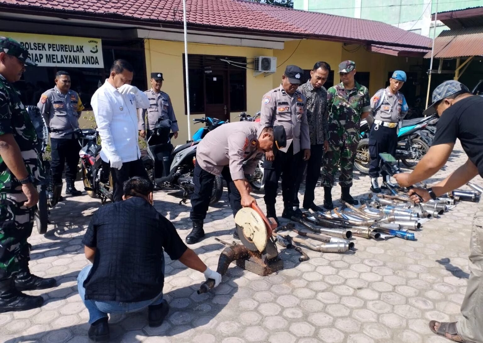 Infoacehtimur.com / Aceh Timur – Kepolisian Sektor (Polsek) Peureulak kota kembali melakukan pemusnahan 53 unit knalpot brong di halaman polsek. Rabu (05/04/2023). Pemusnahan barang bukti inierupakan hasil sitaan yang dilakukan selama kurun waktu tiga bulan tetakhir di wilayah hukum kecamatan setempat dari anak-anak nakal yang suka melakukan atau mengganggu ketertiban umum. Kapolres Aceh Timur, Andy Rahmansyah melalui Kapolsek Peureulak Supriadi mengatakan, 53 unit knalpot brong sepeda motor tersebut disita saat melakukan razia rutin di wilayah hukumnya. “Sebelum pemusnahan ini kita lakukan, mereka sudah diberikan efek jera. Saat sepeda motor disita pelanggar harus membuat surat pernyataan yang ditandatangani serta mengetahui camat,…