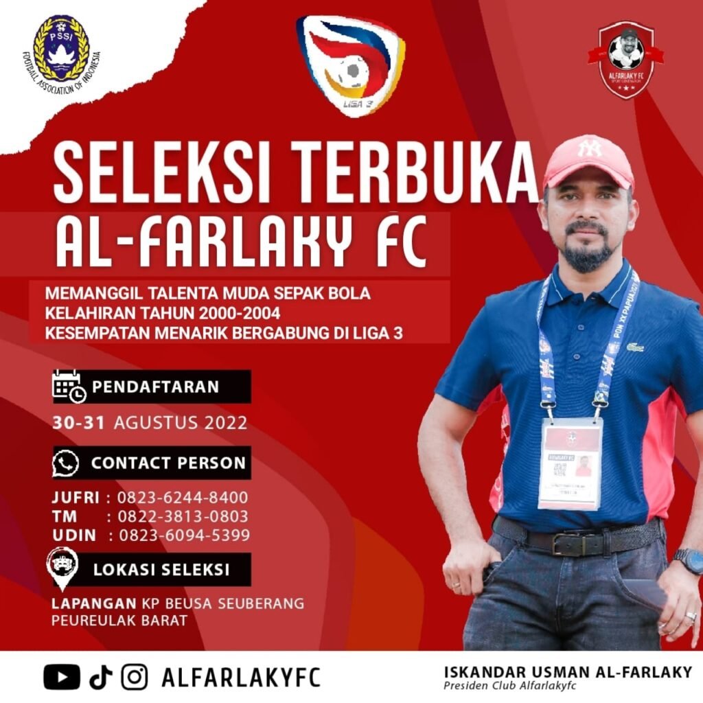 Infoacehtimur.com / Aceh Timur – Memasuki musim kompetisi liga 3 tahun 2022 Tim sepakbola Al-Farlaky FC buka seleksi pemain, yang dijadwalkan pada 30-31 Agustus 2022. Hal ini tentu sangat menarik bagi kaum muda pecinta bola di manapun berada di Aceh Timur untuk memperlihatkan talentanya dan semangat mudanya di ajang liga 3 ini. Al-Farlaky FC yang merupakan pendatang baru di ajang kompetisi amatir PSSI Aceh ini juga akan memanggil lima pemain senior untuk bergabung dengan Laskar Bumi Nurul A’la–julukan Al-Farlaky FC. “ini merupakan pengumuman seleksi resmi yang kita sampaikan di sejumlah platform media sosial Seperti Infoacehtimur dan Al-Farlaky FC,” kata President…