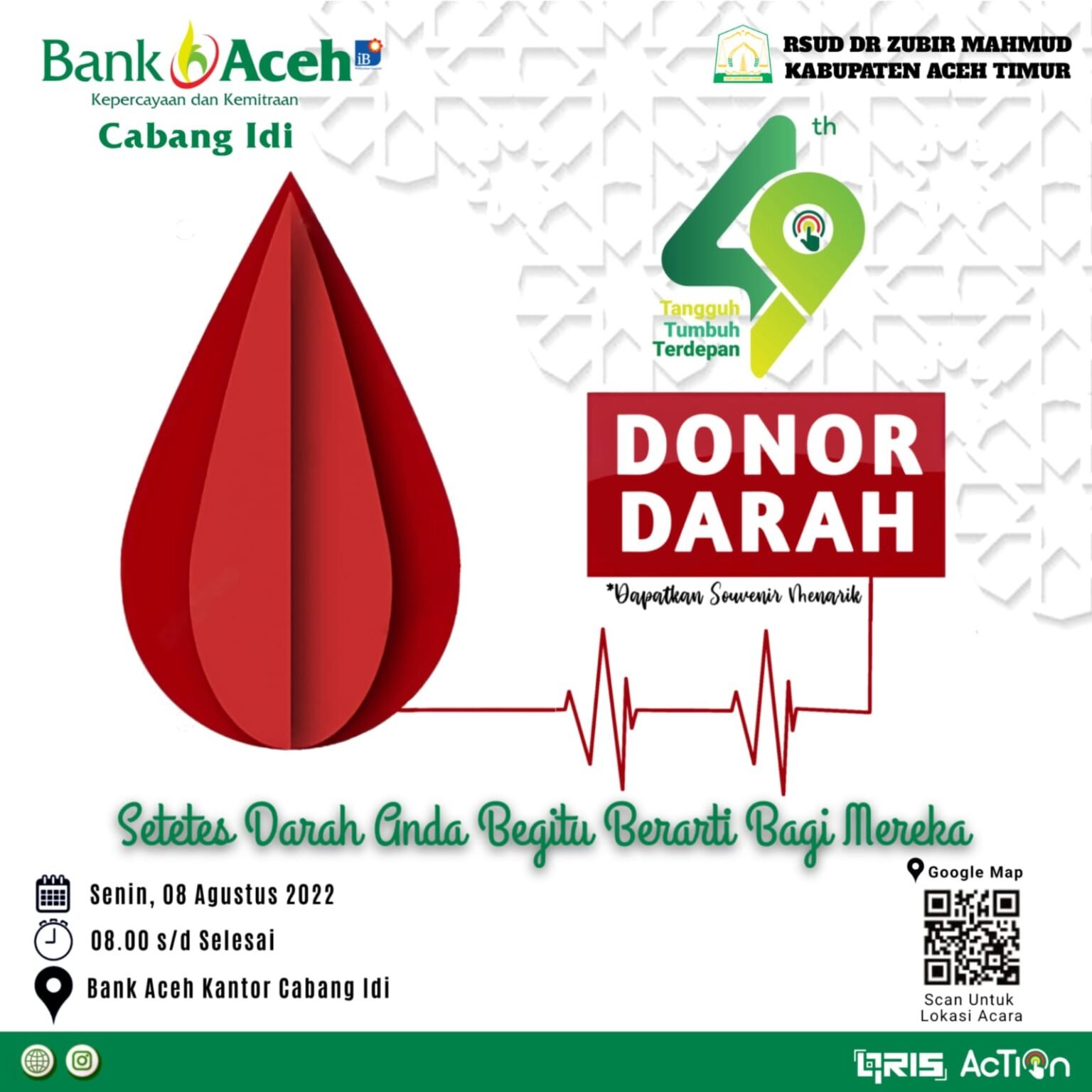 Infoacehtimur.com, Aceh Timur – Dalam rangka memperingati HUT Bank Aceh ke-49 yang jatuh pada hari Sabtu tanggal 06 Agustus 2022, Bank Aceh Cabang Idi kabupaten Aceh Timur, Provinsi Aceh akan mengelar donor dara dengan tema “ setetes darah anda sangat berarti bagi mereka ”. Acara tersebut akan berlangsung di kantor Bank Aceh Syariah Cabang Idi, tepatnya di Jalan Medan-Banda Aceh, Desa Tanoh Anoe, Kecamatan Idi Rayeuk, Kabupaten Aceh Timur. Buka Update: Berita Aceh Timur dan Aceh Bupati Rocky Resmikan Kantor Payment Point Bank AcehGadai Emas Syariah di Bank Aceh, MudahBank Aceh Serahkan Pembagian Laba Untuk Pemkab Aceh Timur Sebesar Rp…