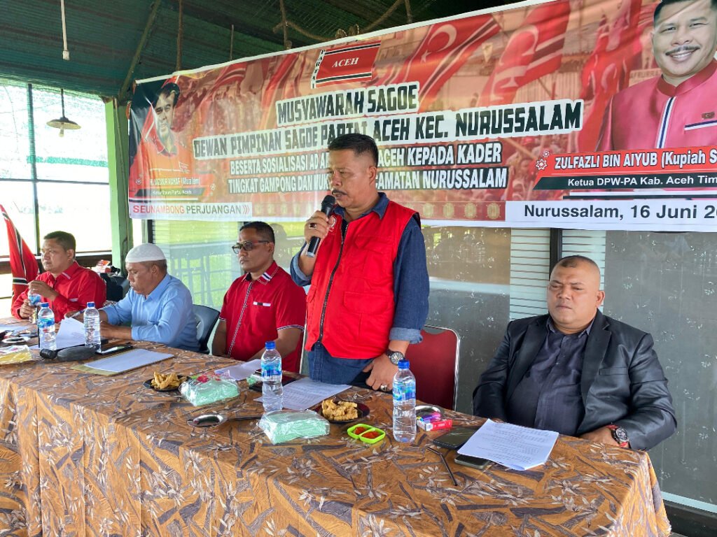 Infoacehtimur.com, Nurussalam – Dewan Pimpinan Sagoe Partai Aceh (DPS-PA) Kecamatan Darul Falah dan Kecamatan Nurussalam melaksanakan Musyawarah Sagoe pada Senin (16/6/2025). Kemudian pada Selasa (17/6), berlangsung Musyawarah Sagoe DPS-PA Rantau Selamat. Ketua DPW-PA Aceh Timur Zulfazli Aiyub hadir dalam Musyawarah Sagoe pada Senin (16/6), menegaskan tentang pentingnya persatuan Bangsa Aceh, persatuan para kader Partai Aceh serta pendukung partai. “Pengurus, anggota maupun pendukung partai aceh harus mendukung langkah ketua DPS, agar sukses agenda politik partai aceh untuk masyarakat aceh timur, khususnya. Persatuan bangsa sangat penting, seperti kasus soal 4 pulau di Singkil, kita dipertimbangkan oleh Pemerintah Pusat karena persatuan. Beu meusaboh,…