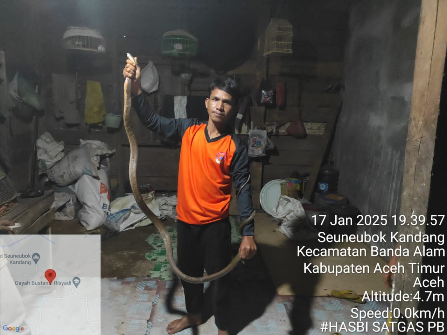 Infoacehtimur.com, Aceh Timur – Badan Penanggulangan Bencana Daerah (BPBD) Aceh Timur kembali berhasil menangkap seekor ular jenis kobra di rumah warga bernam Nurdin Yusuf, warga Gampong Seuneubok Kandang, Kecamatan Banda Alam. Jumat, (17/1/2025). Kejadian ini sontak membuat penghuni rumah panik, mengingat ular kobra dikenal sebagai salah satu ular paling berbisa di dunia. Baca Juga: Ular Kobra Sepanjang 2,5 Meter Masuk Pekarangan Warga Idi Rayeuk Mendapat laporan dari warga, tim BPBD langsung bergerak cepat ke lokasi dengan peralatan khusus, operasi penangkapan berlangsung dramatis, dan ularpun berhasil ditangkap tanpa insiden berbahaya. “Kami sangat khawatir, apalagi ada anak-anak di rumah. Beruntung tim BPBD…