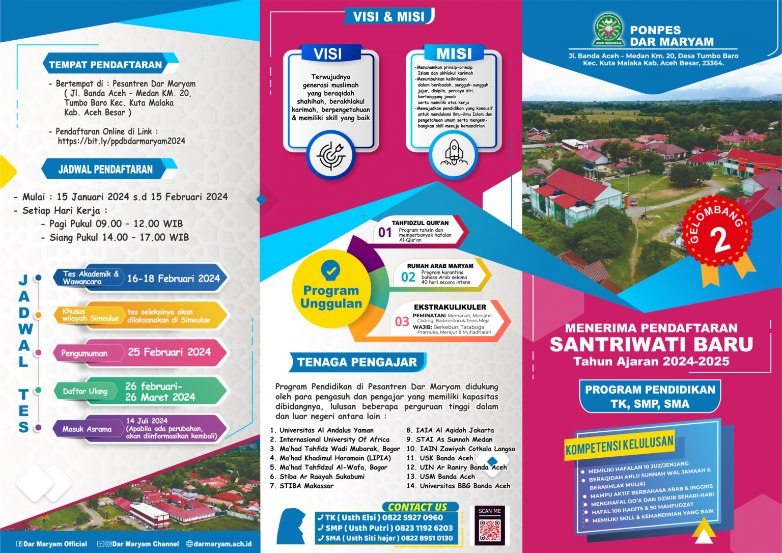 🔰 PENDAFTARAN PESERTA DIDIK BARU RESMI DIBUKA🔰 PONPES DAR MARYAM BINTI IBRAHIM ACEH BESAR *_TAHUN AJARAN 2024-2025_* *===============================* *🏫 PILIHAN PROGRAM:* >> TK >> Jenjang SMP >> Jenjang SMA *PROGRAM UNGGULAN* >> Tahfizhul Qur’an >> Rumah Arab Maryam >> Ekstrakulikuler *📑 Kompetensi Kelulusan* 1. Memiliki hafalan 10 juz/jenjang . 2. Beraqidah Ahlu Sunnah Wal Jamaah & Berakhlaq Mulia. 3. Mampu aktif berbahasa Arab dan iggris. 4. Menghafal Do’a & Dzikir Sehari-hari 5. Hafal 100 Hadist dan 50 mahfudzat. 6. Memiliki kecakapan Skill & Kemandirian Yang Baik. 🗓️ *Waktu Pelayanan PPDB* >> *Mulai 15 Januari 2023 s.d 15 Februari 2024* >>…