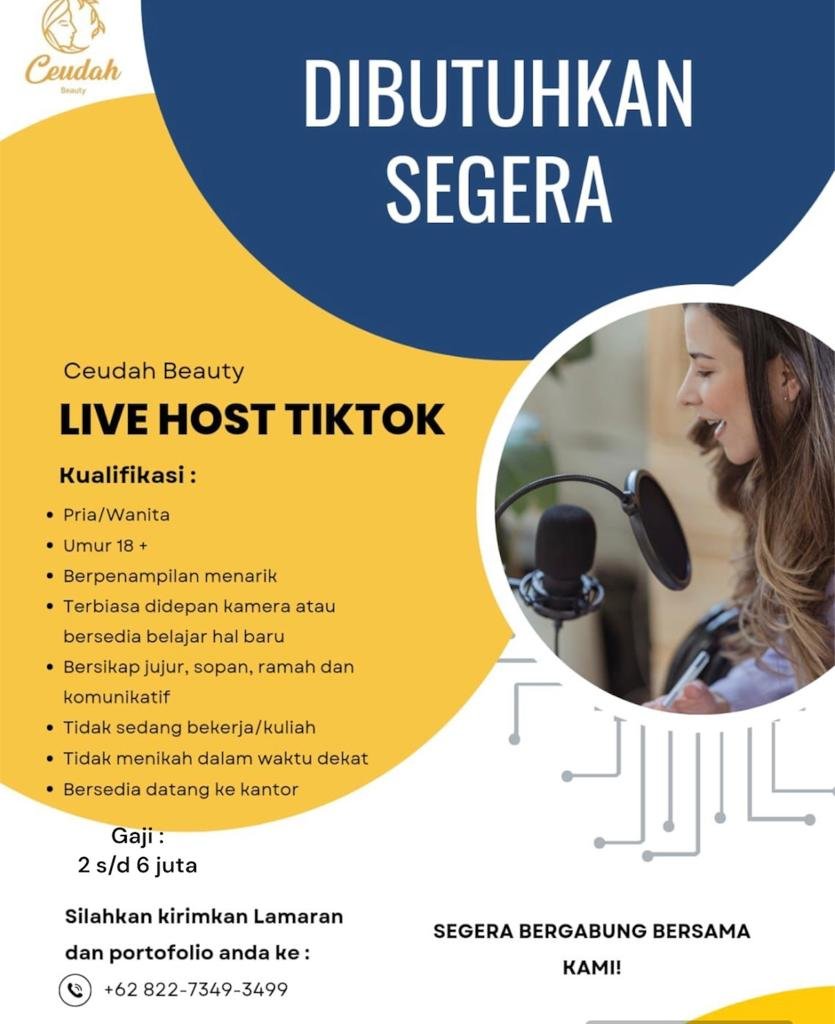 Info Aceh Timur / Lowongan Kerja – Live host TikTok adalah orang yang menjadi penyiar langsung untuk aplikasi TikTok. Dalam layanan live tersebut, para host dapat berinteraksi langsung dengan penontonnya dan membuat konten yang menarik dan menghibur. Host atau pemandu live streaming TikTok ini umumnya adalah seorang content creator atau seller yang menjual produk. Di Indonesia, rata-rata gaji host live streaming TikTok di tahun 2023 berkisar antara Rp 1,5 juta hingga Rp 5 juta per bulan. Namun, gaji yang ditawarkan untuk menjadi host live streaming Tiktok untuk posisi yang sedang dibuka ini berkisar antara Rp 4 juta hingga Rp 8…