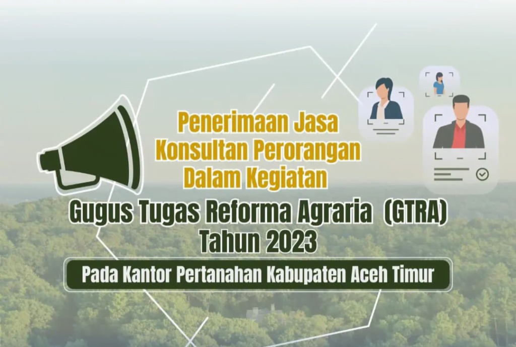 Infoacehtimur.com / Lowongan Kerja – Kantor Pertanahan Kabupaten Aceh Timur membuka lowongan Jasa Konsultan Perorangan Dalam Kegiatan Gugus Tugas Reforma Agraria (GTRA) Tahun 2023. Formasi Yang Dibutuhkan :Konsultan Perorangan Gugus Tugas Reforma Agraria (KP-GTRA) Kualifikasi pendidikan S1 dan Besar jasa Honor konsultan yang akan di berikan sebanyak Rp. 4.100,000,-/Bulan. Adapun Kualisifikasi yang di butuhkan: Pendaftaran konsultan perorangan dibuka mulai tanggal 15 Maret 2023 dan ditutup tanggal 18 Maret 2023; Syarat Pendaftaran :a. Surat lamaran diketik dan ditandatangani di atas materai Rpl0.000 yang ditujukankepada Tim Seleksi Pengadaan Konsultan Perorangan pada Kantor Pertanahan Kabupaten Aceh Timur (berupa scan); b. Daftar Riwayat Hidup…