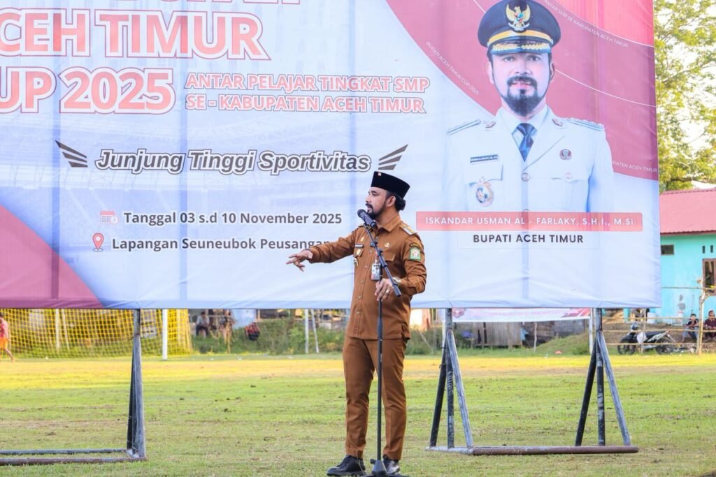 Infoacehtimur.com, Aceh Timur – Bupati Aceh Timur, Iskandar Usman Al-Farlaky, membuka secara resmi Piala Bupati Aceh Timur Cup 1 antar pelajar tingkat SMP se-Kabupaten Aceh Timur. Acara pembukaan ini digelar di Lapangan Seuneubok Peusangan, Peureulak, Senin (3/11/2025). Dalam sambutannya, Bupati Aceh Timur, Iskandar Usman Al-Farlaky, menekankan pentingnya semangat kompetisi dan sportivitas dalam setiap kegiatan olahraga. “Ajang ini bukan hanya tentang mencari juara, tetapi juga tentang membangun karakter dan sportivitas para pelajar,” ujarnya. Baca Juga: Turnamen Sepakbola Piala Bupati Aceh Timur Cup I 2025 Resmi Dibuka Baca Juga: Ranjoe Laot FC Masuk Delapan Besar Piala Tarkam Turnamen ini diselenggarakan oleh Dinas…