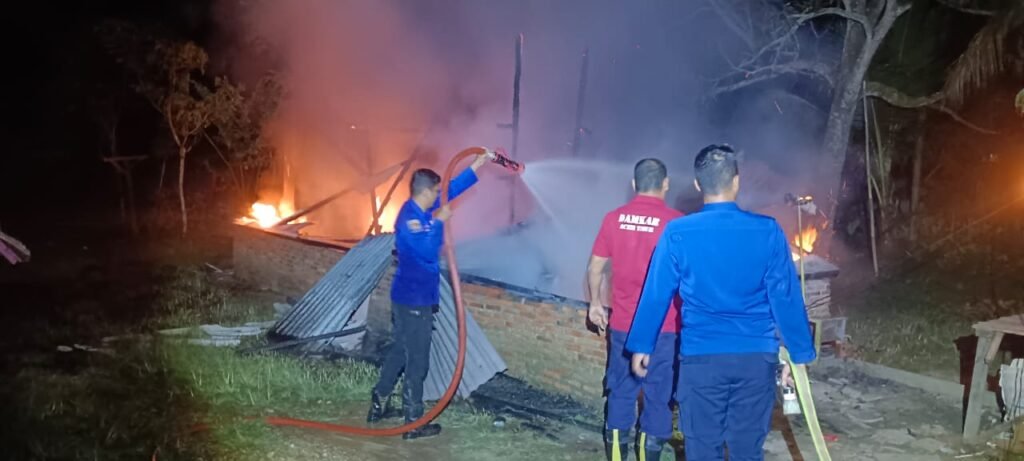 Infoacehtimur.com, Aceh Timur – Kebakaran hebat melanda sebuah rumah semi permanen di Gampong Seuneubok Rambong, Kecamatan Idi Rayeuk, Kabupaten Aceh Timur pada Sabtu malam, 7 Juni 2025, sekitar pukul 19.31 WIB. Rumah milik Nada Sara (27 tahun) tersebut tidak bisa diselamatkan meskipun sejumlah mobil pemadam kebakaran dari Pos Idi diturunkan ke lokasi kejadian. Warga sekitar berusaha membantu memadamkan api, namun api sudah terlalu besar dan rumah semi permanen tersebut akhirnya ludes terbakar. Petugas pemadam kebakaran berupaya keras untuk mengendalikan situasi dan mencegah api menjalar ke rumah-rumah lainnya di sekitar lokasi kejadian. Baca Juga: Pawai Islami akan Meriahkan Festival Anak Shaleh…