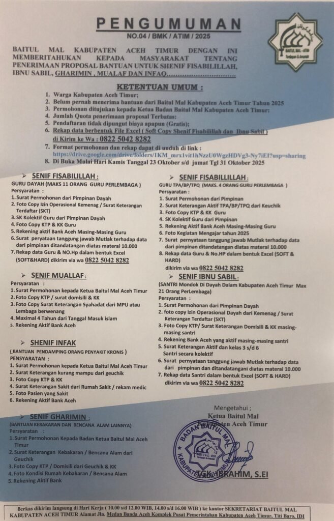 Infoacehtimur.com, Aceh Timur – Baitul Mal Aceh Timur memberitahukan kepada seluruh masyarakat Aceh Timur bahwa pendaftaran untuk menerima bantuan berupa fisabilillah, ibnu sabil, gharimin, mualaf, dan infaq (bantuan pendampingan orang sakit) telah dibuka.