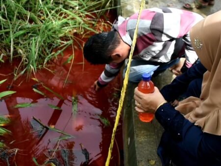 Lhokseumawe | Puluhan warga saling bergantian menyaksikan fenomena alam air parit berwarna merah di Jalan Banda Aceh-Medan di Gampong Meunasah…