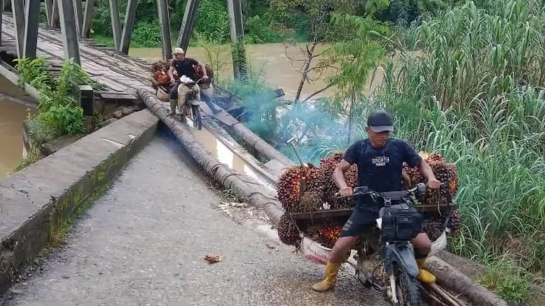 Foto: Kepala Desa Srimulya.Masyarakat Desa Srimulya, Kecamatan Peunaron sedang mengangkut sawit melawati jembatan penghubung, Rabu (3/1/2023).