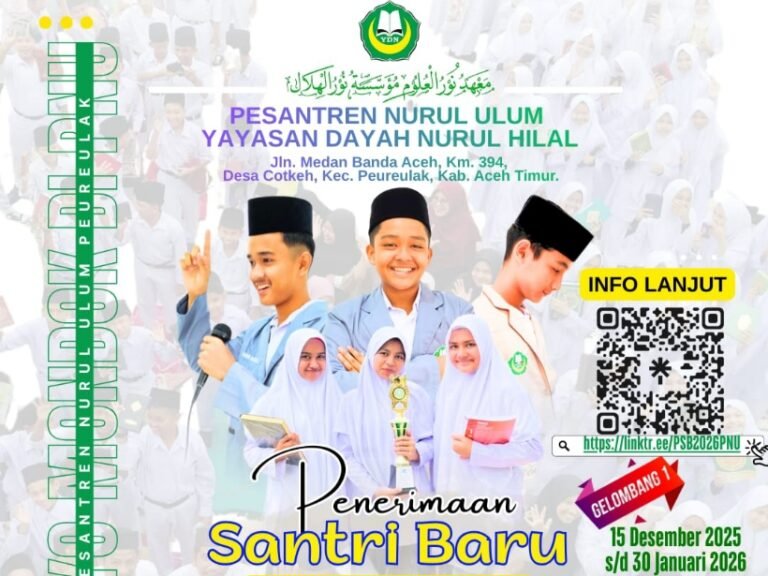 Infoacehtimur.com, Peureulak – Pesantren Nurul Ulum Peureulak kembali membuka penerimaan santri baru tahun 2026 untuk putra-putri terbaik aceh supaya menempuh pendidikan berkualitas, menjadikan anak bangsa sebagai insan berakhlak dan bertaqwa pada Allah.