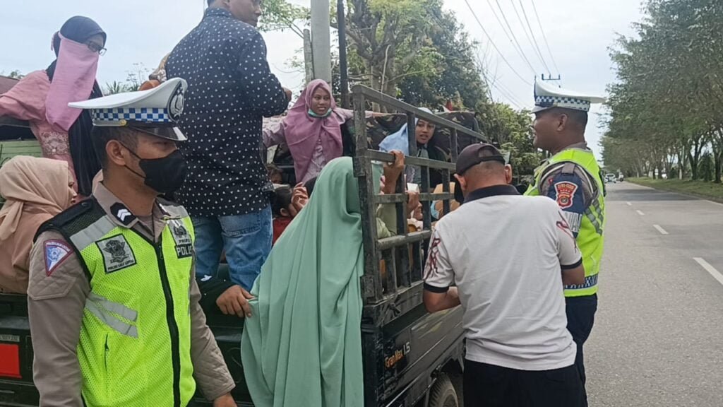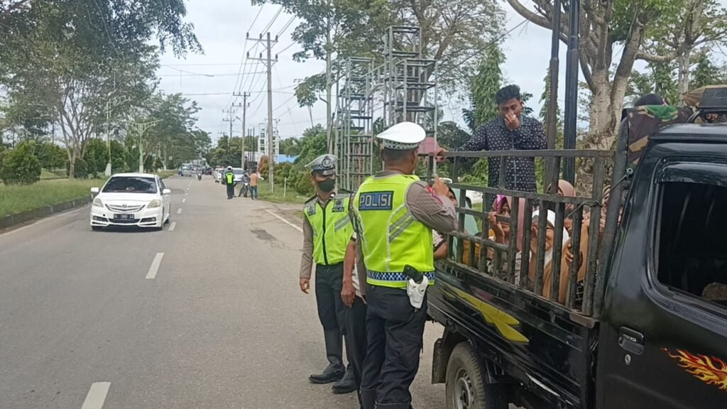 Infoacehtimur.com / Aceh Timur – Satuan Polisi Lalu Lintas (Satlantas) Polres Aceh Timur kembali menghimbau dan menertibkan mobil barang atau mobil bak terbuka yang mengangkut orang saat melintas di ruas Jalan Medan-Banda Aceh dalam wilayah hukum Polres Aceh Timur.