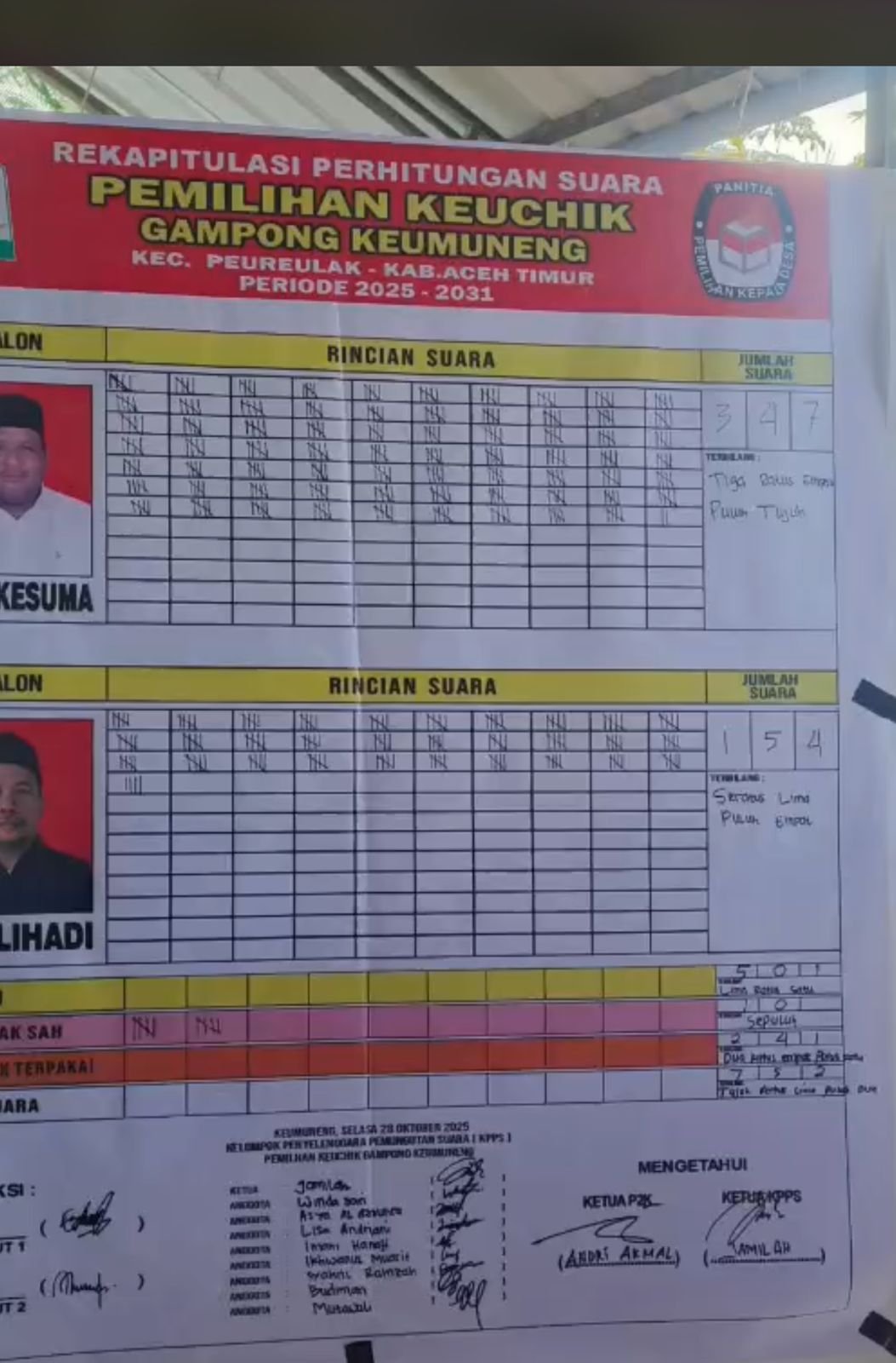 Infoacehtimur.com, Aceh Timur – Pemilihan Keuchik Gampong Kemuning di Kecamatan Peureulak, Kabupaten Aceh Timur, berlangsung hari ini, Selasa (28/10/2025). Pemilihan ini diikuti oleh dua kandidat calon, yaitu Wira Kesuma dengan nomor urut 1 dan Rizalihadi dengan nomor urut 2.