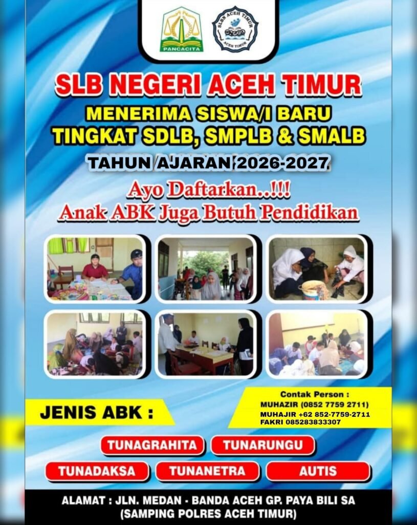 Infoacehtimur.com | Aceh Timur – Bagi orang tua yang memiliki anak berkebutuhan khusus (ABK), kini ada harapan baru untuk memberikan pendidikan yang layak bagi anak-anak mereka. Sekolah Luar Biasa (SLB) Negeri Aceh Timur membuka pendaftaran siswa baru untuk tahun ajaran 2026.