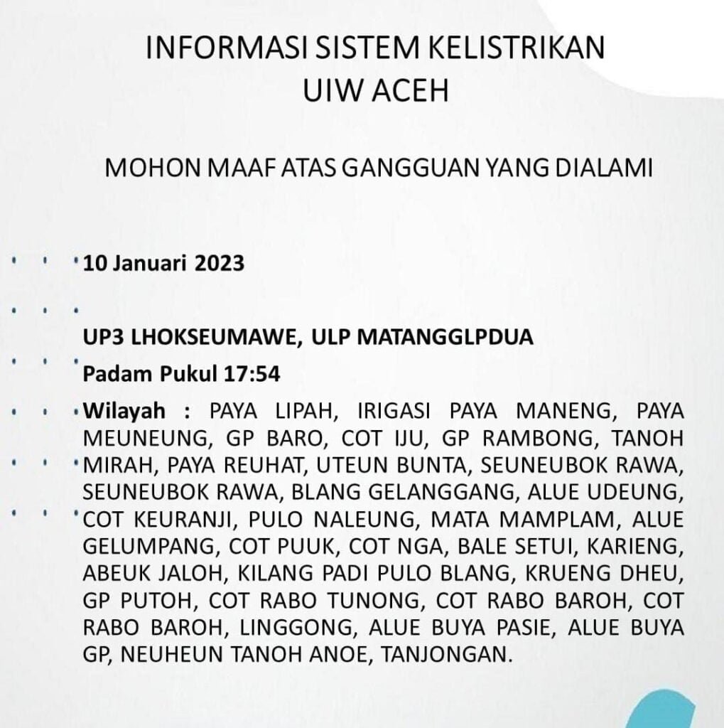 Menurut informasi yang berdar dalam grup media sosial menjelaskan ada ganguan kelistrikan di UIW ACEH dan meraka memohon maaf atas gangguan yang di alami.