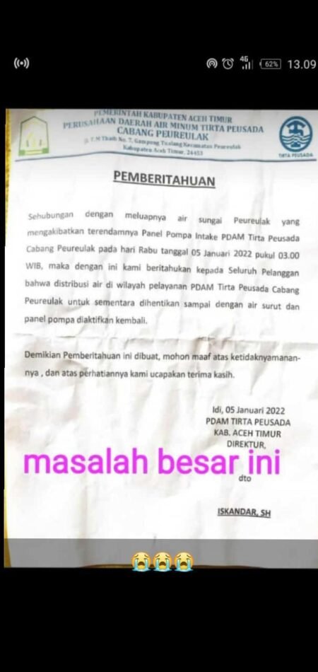 Aceh Timur | Dengan meluapnya sehubungan air Peureulak yang sungai mengakibatkan terendamnya Panel Pompa Intake PDAM Tirta Peusada Cabang Peureulak…