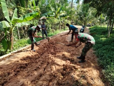 INFOACEHTIMUR.COM | Babinsa Koramil 17/Idi Tunong Kodim 0104/Aceh Timur, Serda Sahrul Ilham bersama Kopda Miswanto ajak warganya benahi jalan yang…