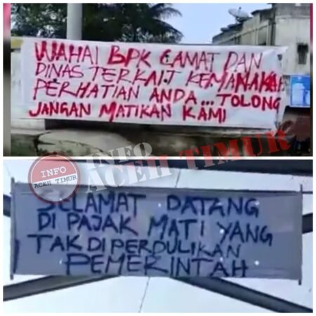 Infoacehtimur.com | Aceh Timur – Spanduk Bentuk Protes Terhadap Pemerintah Aceh Timur di jalan pajak Kota Peureulak bergantungan. Tepatnya di…